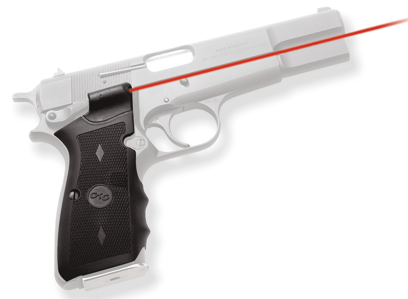 These Lasergrips replace the grip panels on a Browning Hi-Power pistol and integrate a red laser (633nM wavelength) with 5mW output for target acquisition. The laser provides a 0.50" dot at 50 feet and features windage and elevation adjustments. Powered by a CR2032 battery, they weigh less than 1 ounce and are finished in black rubber overmold.