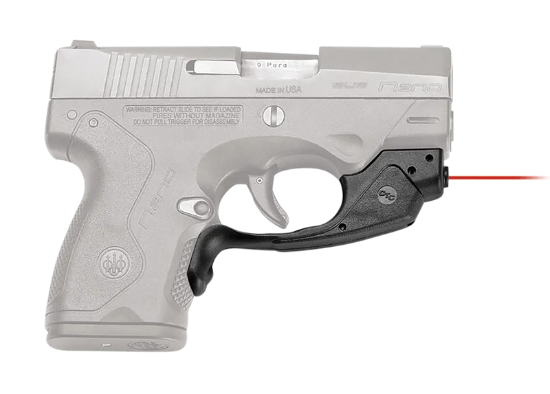 This Crimson Trace Laserguard is a 5mW red laser sight designed specifically for Beretta Nano pistols, mounting via trigger guard attachment. It features windage and elevation adjustments, a 0.50" dot size at 50 feet, and operates on a CR1/3N battery with an effective range of 50 feet. The compact black polymer design enhances accuracy for target acquisition and aiming.