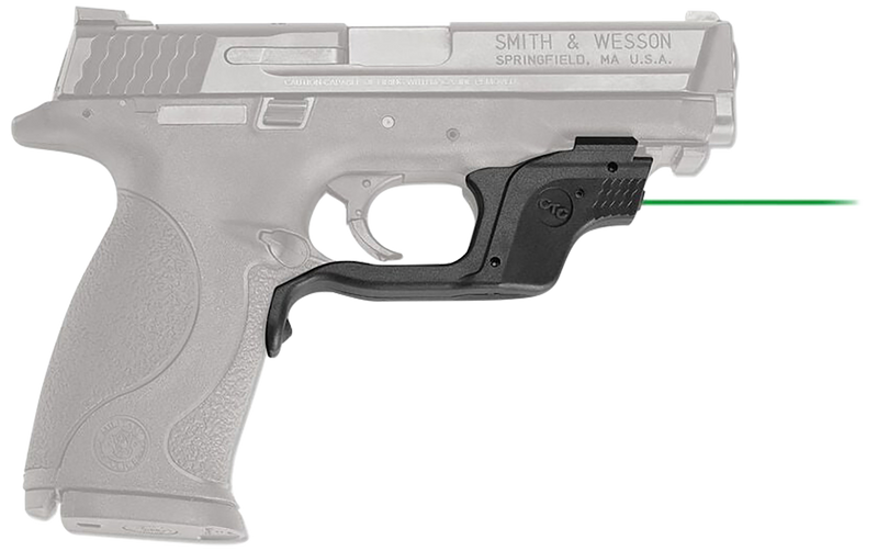 The Crimson Trace Laserguard is a trigger guard-mounted green laser sight designed for Smith & Wesson M&P full-size and compact pistols. It features a 5mW green laser with windage and elevation adjustments, delivering a 0.50" dot at 50 feet with an effective range of 50 feet. The laser activates via instinctive trigger guard activation and operates for over 2 hours on a single CR1/3N battery.