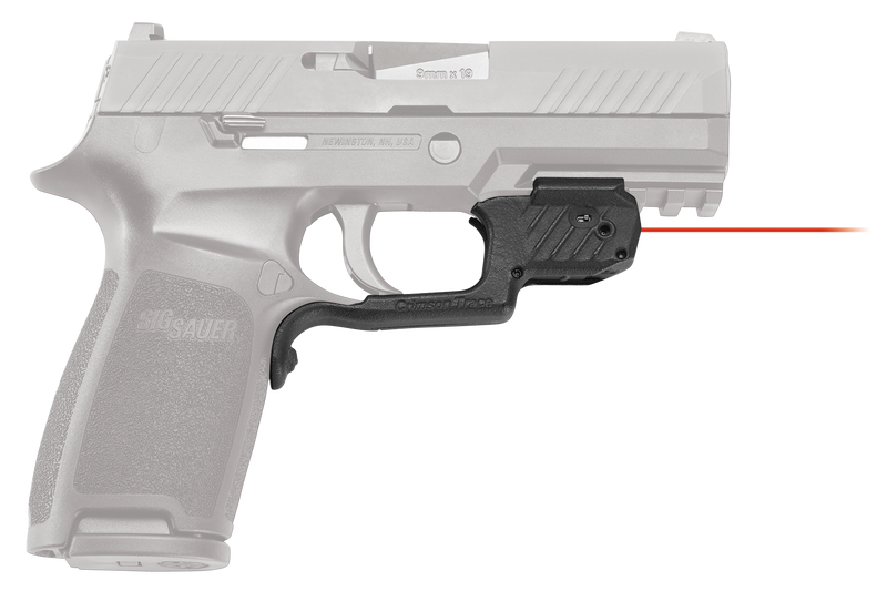 This trigger guard-mounted red laser sight is designed for Sig P320 full-size models, M17, and M18 pistols. It features a 5mW red laser with a 50-foot effective range and 0.50" dot size at 50 feet, with windage and elevation adjustments. The black polymer construction uses a CR1/3N battery and includes overmold front activation for intuitive operation.