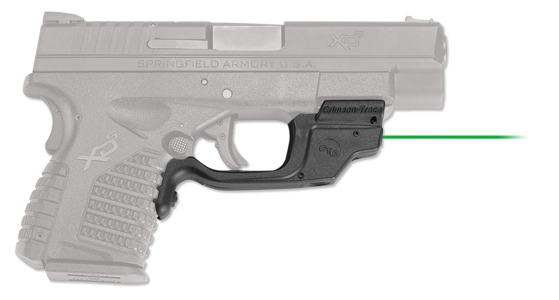 The Crimson Trace Laserguard is a trigger guard-mounted laser sight specifically designed for the Springfield XD-S pistol. It features a 5mW green laser (532nm wavelength) with a 0.50" dot size at 50 feet and includes windage and elevation adjustments. The compact polymer construction activates intuitively and operates on a CR1/3N battery.