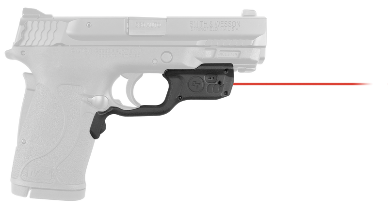 The Crimson Trace Laserguard is a red laser sight designed for Smith & Wesson M&P Shield 380EZ, 9EZ, and M&P 22 Compact pistols. It features front activation with Instinctive Activation technology, windage and elevation adjustment, and delivers approximately 4 hours of battery life on a single CR1/3N lithium battery (included). The sight mounts via trigger guard and produces a 0.50" dot at 50 feet with a 633nM red laser.