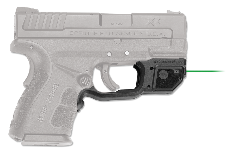 This trigger guard-mounted green laser sight is designed specifically for Springfield XD Mod.2 pistols and installs securely in minutes. The 5mW laser produces a bright dot at 50 feet with a 0.50" dot size and features windage and elevation adjustments for precise aiming. The durable black polymer construction houses a CR1/3N battery and provides front-activation for instinctive target acquisition.