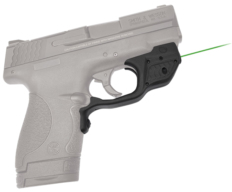 This trigger guard-mounted green laser sight is designed for Smith & Wesson M&P Shield and M&P Shield M2.0 pistols in 9mm and .40 S&W. It features instinctive pressure activation, factory sighting at 50 feet with a 0.50" dot, and user-adjustable windage and elevation. The sight runs on a single CR1/3N lithium battery with over two hours of battery life and includes a three-year full warranty.