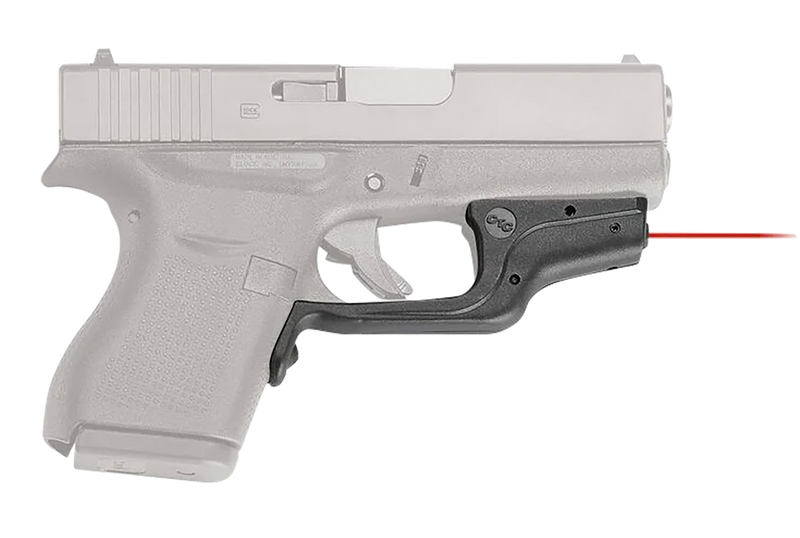 The LG-443 Laserguard is a trigger guard-mounted red laser sight (633nM wavelength, 5mW power) designed for Glock 42/43/43X/48 pistols. It features instinctive activation through normal grip and is fully adjustable for windage and elevation, with a 50-foot effective range and 0.50-inch dot size at that distance. The black polymer design weighs 3.20 oz and uses a CR1/3N battery for operation.