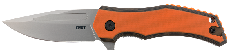 The CRKT Fawkes is a 2.74" clip point folding knife with a flipper opening mechanism and 4116 stainless steel blade featuring a plain edge. The knife features a black and orange G10 handle with an integrated pocket clip, has an overall length of 6.50" when open, and weighs 3 oz.