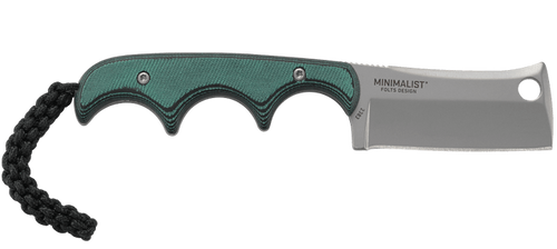 The CRKT Minimalist Cleaver is a compact fixed blade knife featuring a 2.13" 5Cr15MoV stainless steel blade with a plain edge and bead blasted finish. It has a green contoured resin-infused fiber handle and comes with a polypropylene sheath and paracord lanyard, making it suitable for general cutting tasks and outdoor use.