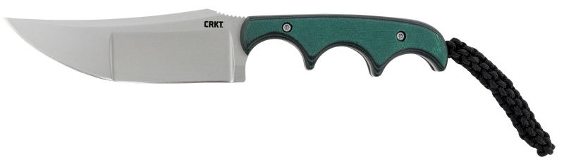 The CRKT Minimalist Katana is a compact fixed blade neck knife featuring a 3.56" plain edge blade made from 8Cr13MoV stainless steel. It has a green resin-infused fiber handle, weighs 2.4 oz, and includes a thermoplastic sheath with paracord attachment for versatile carry options.