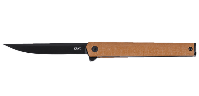 The CRKT CEO Flipper is a compact folding knife with a 3.35" blade, designed for everyday carry and general cutting tasks. Features a flipper mechanism for one-handed opening and a desert tan finish. Dimensions are 11.4" overall length when open with a 2.7" width.
