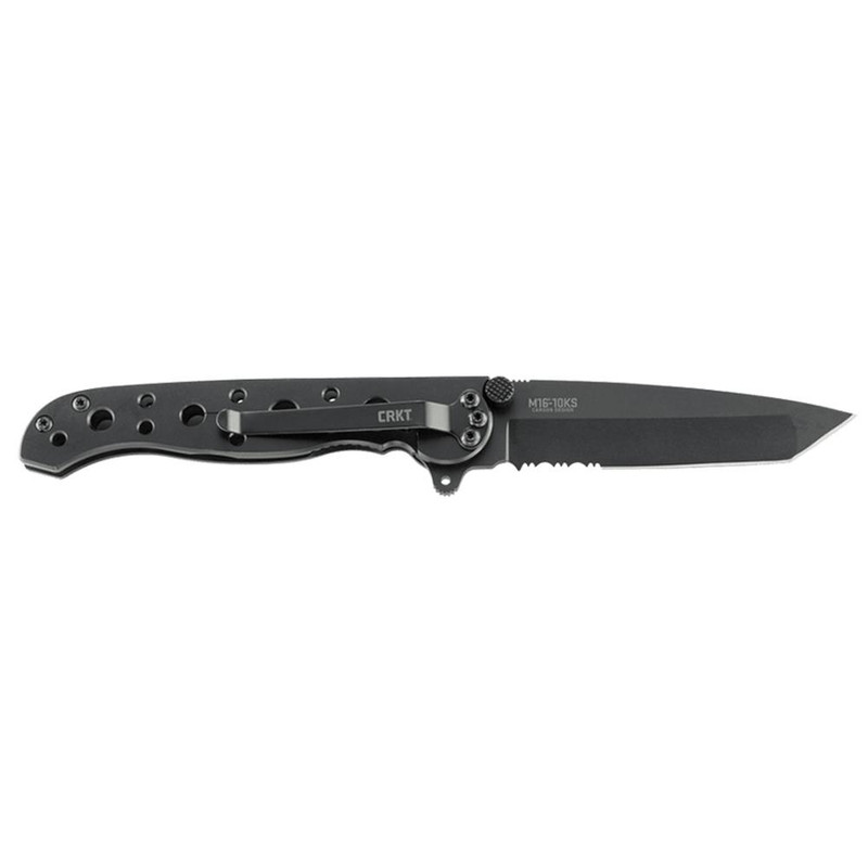 The CRKT M16-10KS is a 3" tanto blade folding knife designed by Kit Carson, featuring a frame lock mechanism with a thick lock bar for secure blade retention. The stainless steel construction includes a black EDP finish for corrosion resistance and triple point serrations for cutting fibrous materials. This pocket knife has an overall length of 7" and weighs 2.6 oz, making it suitable for tactical or everyday carry applications.