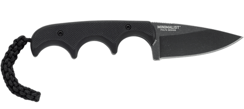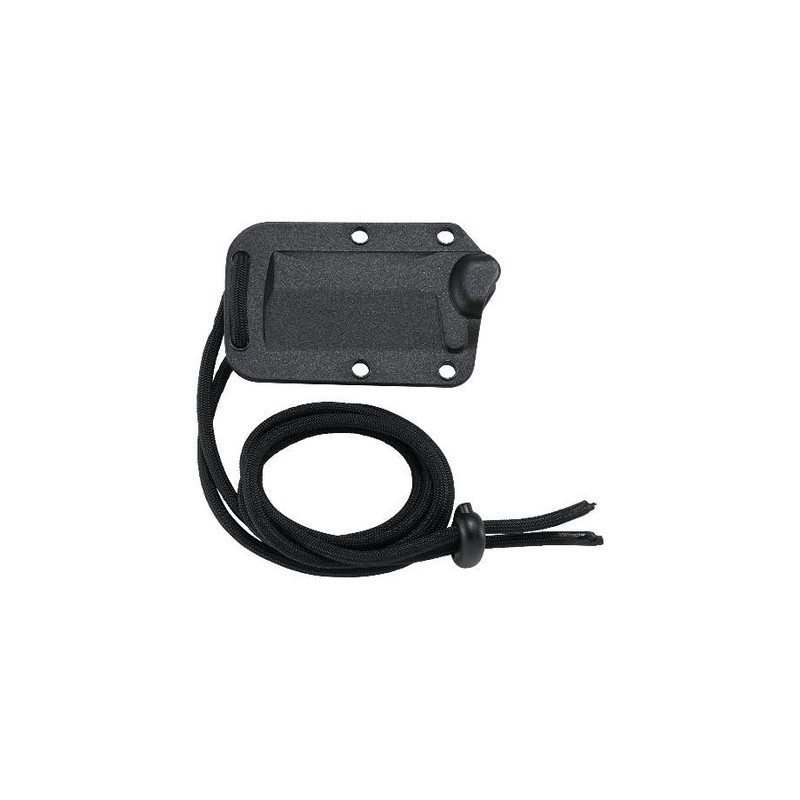 Compact fixed blade neck knife with a 2 1/8" cleaver-style blade made from 5Cr15MoV high carbon stainless steel that takes an edge well. Features a black stonewash finish, G10 handle, and thermoplastic sheath with paracord, weighing 1.7 oz with an overall length of 5".