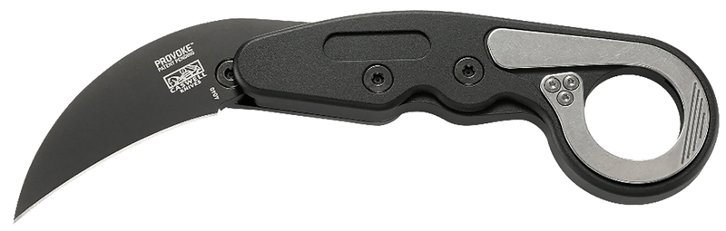 The CRKT Provoke is a 2.41" folding knife featuring a hawkbill/karambit blade made from D2 steel with a black titanium nitride finish and plain edge. It utilizes innovative Kinematic technology for rapid blade deployment via thumb push and includes a pocket clip. The knife has a 6061 aluminum handle, weighs 6.10 oz, and has an overall length of 7.25" when open.