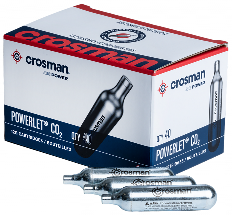 Crosman Powerlet 12-gram CO2 cartridges in a 40-count package designed to power gas-operated airguns. These cartridges provide a snug fit and consistent seal for reliable performance across most gas-powered air rifles and pistols. Each cartridge delivers 12 grams of CO2 for extended shooting sessions.