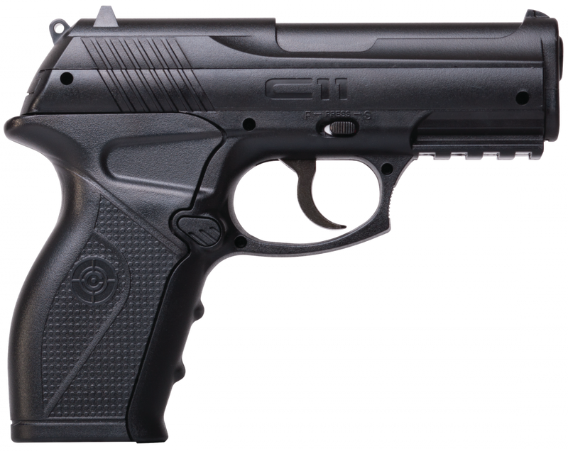 The Crosman C11 is a semi-automatic CO2-powered air pistol chambered in .177 BB with a 20-round magazine capacity and smooth bore barrel. It delivers velocities up to 480 fps and features fixed blade front and fixed notch rear sights for target shooting. The pistol has black polymer grips, weighs 76 oz, and measures 9.8" in length with a single-stage trigger and slide safety.
