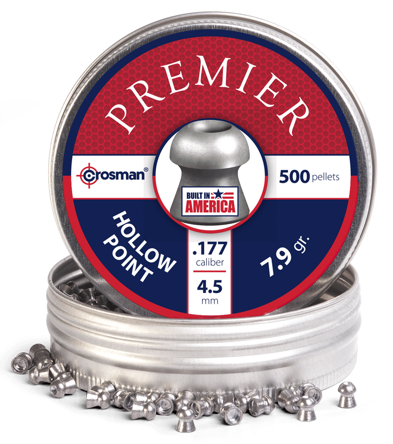 Crosman Premier Hollow Point pellets in .177 caliber are lead hollow point projectiles designed for target shooting and plinking. Each tin contains 500 pellets weighing 7.9 grains. These pellets deliver consistent performance for air rifle use.