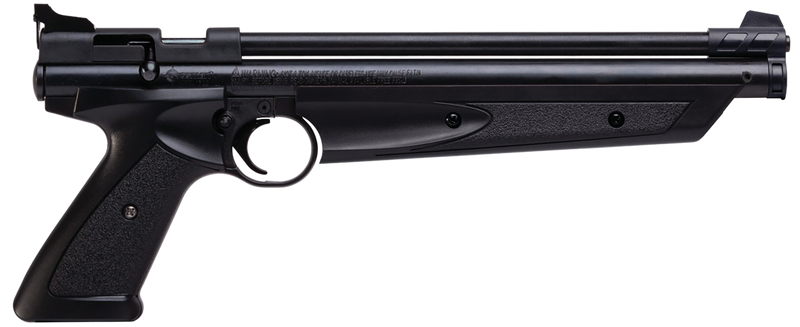 Single-shot pneumatic air pistol chambered in .177 caliber with a 10" rifled steel barrel and fixed front/adjustable rear sights. Features a pump action design with black polymer grips and crossbolt safety, delivering approximately 600 fps. Designed for target shooting and recreational play.