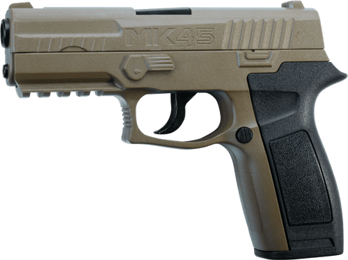 CO2-powered air pistol chambered in BB with full/semi-auto capability and blowback action. Features a 20-round capacity, fixed front blade and rear notch sights, full metal frame with black polymer grips, and achieves 400 feet per second. Includes selector safety and smooth bore brass barrel.
