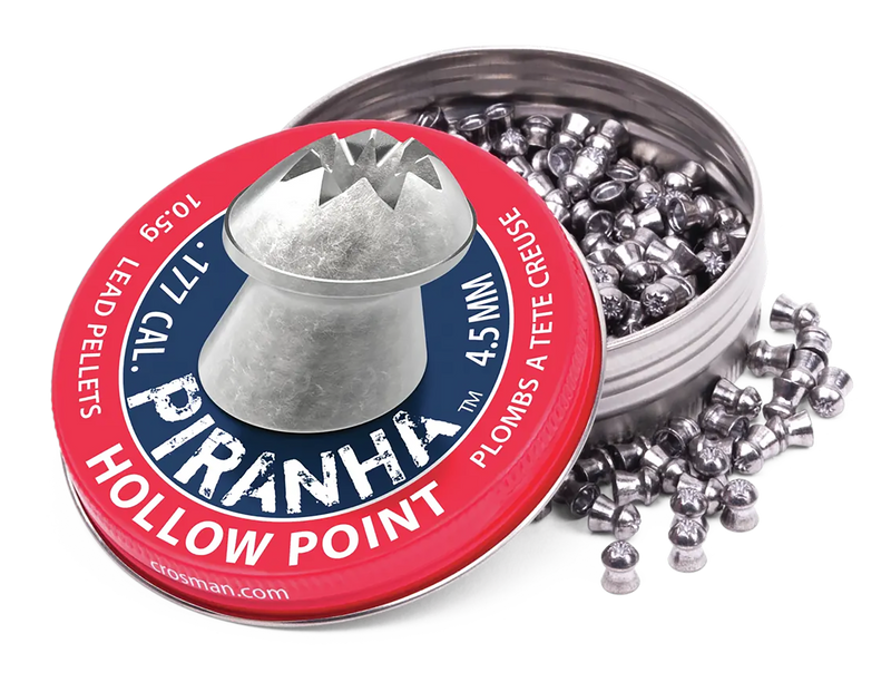 Daisy Piranha .177 caliber lead pellets feature a hollow point design optimized for small game and nuisance animal hunting. Each tin contains 400 pellets weighing 10.5 grains, combining the penetration of a domed pellet with hollow point expansion characteristics. This product is compatible with .177 caliber air rifles and air pistols.
