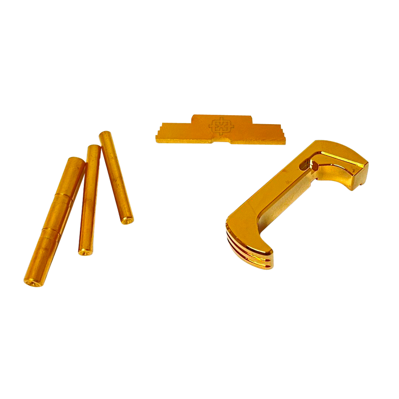 This 3-piece kit from Cross Armory is designed for Glock Gen5 models (17, 19, 26, and 34) and features gold anodized steel and aluminum construction. The extended kit measures 5.5" L x 4.7" W x 1.1" H and includes precision-machined components for improved ergonomics and performance.