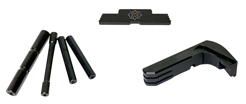 This 3-piece upgrade kit is designed for P80 Gen1-3 pistol frames and includes essential components for frame completion and customization. The kit features black finish components with compact dimensions (5.5" L x 4.7" W x 1.1" H) and is compatible with 80% lower receiver builds.