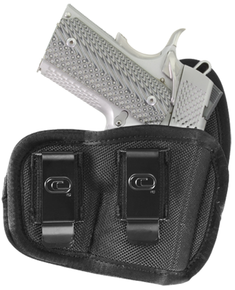 Inside-the-waistband (IWB) holster designed for micro-frame handguns with 1-1.50" barrels. Features ballistic nylon construction with dual belt clips for secure retention and right-hand draw. Size 01 holster measures 10.9" L x 9.1" W x 2.6" H.
