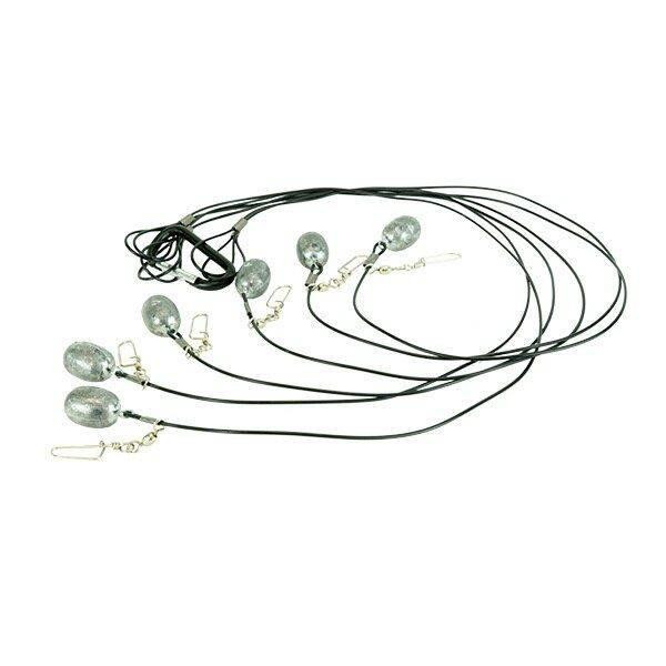 This 6-pack decoy rigging system includes 30 inch Texas Rigs with 4 oz ball weights, designed for waterfowl decoy setup and deployment. The system provides a complete rigging solution for anchoring and positioning decoys in water. Includes California Prop 65 warning.