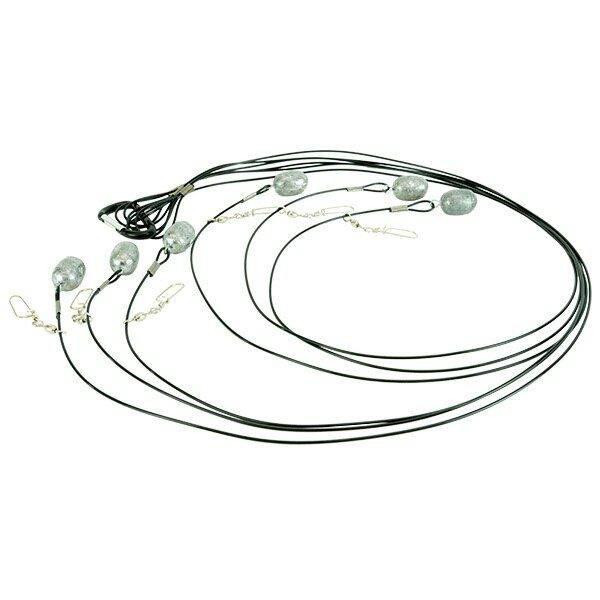 This decoy rigging system includes six 42-inch Texas rigs with 4 oz ball weights for waterfowl decoy setup. The system is designed for easy deployment and anchoring of decoys in water. Includes California Prop 65 warning.