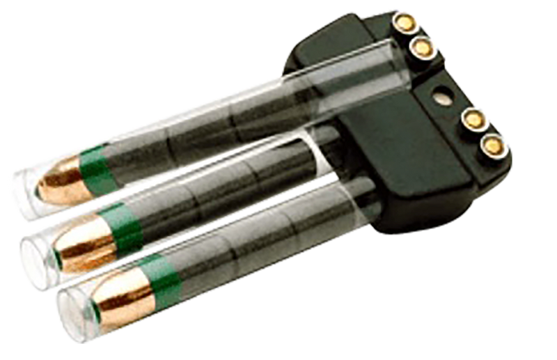 The Powerbelt Speedclip is a field-mounted ammunition organization system designed for muzzleloading rifles that holds three pre-loaded rounds with Powerbelt bullets and magnum pellet charges, plus four 209 primers. The weatherproof and impact-resistant plastic clip easily attaches to gun slings, belts, or lanyards for quick access to reloads without fumbling through pockets. This accessory is designed to reduce reload time in the field during hunting situations.