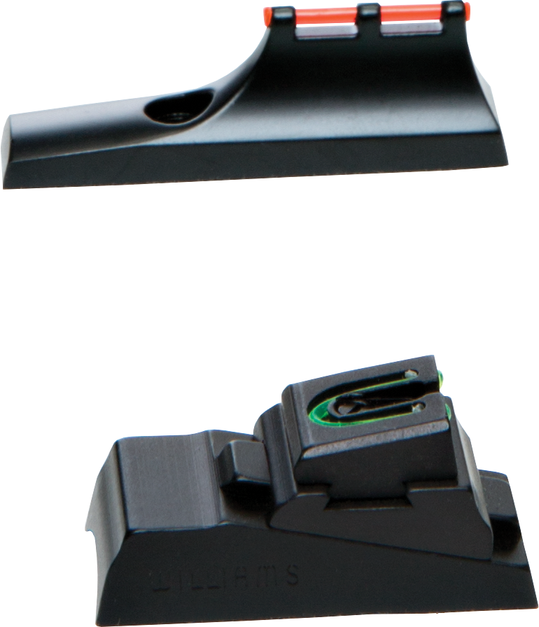 This fiber optic sight set features a red fiber optic front sight and green fiber optic rear sight designed for CVA muzzleloaders and rifles manufactured after 2001. The polymer frame construction with fiber optic elements enhances accuracy and visibility in various lighting conditions. These sights are built for durability and reliability in the field.