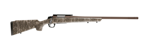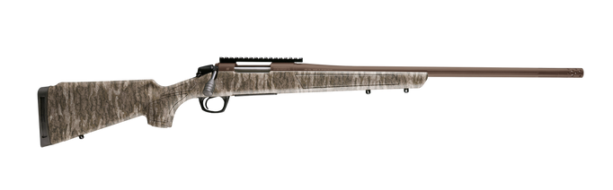The CVA Cascade XT is a bolt-action rifle chambered in 350 Legend with a 22" fluted and threaded barrel (5/8x24) and 4+1 round capacity. Features a Midnight Bronze Cerakote finish, Mossy Oak New Bottomland camo stock with adjustable length of pull, radial muzzle brake, and includes a two-piece scope base. This optic-ready rifle weighs 7.25 lbs and has an overall length of 42.5".