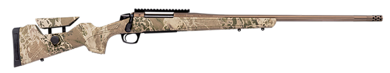 The CVA Cascade is a bolt-action rifle chambered in 7mm Rem Mag with a 24" threaded steel barrel featuring smoked bronze Cerakote finish. It includes a muzzle brake, adjustable comb and length-of-pull synthetic stock in Realtree Hillside camo, and ships with a 3+1 round capacity. This long-range hunter weighs 8.70 lbs with a 1:9.5" twist rate and is purpose-built for extended-range hunting applications.