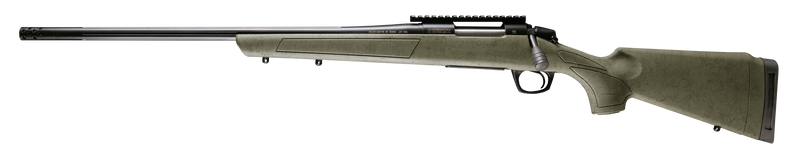 The CVA Cascade XT is a left-hand bolt-action rifle chambered in 6.5 PRC with a 24" fluted barrel threaded 5/8x24 for muzzle devices. It features a graphite black Cerakote finish, OD green camo stock with black web detailing, adjustable length of pull, and includes two-piece scope base. This rifle weighs 7.5 lbs and has a 1-in-8 rate of twist with a 3+1 round capacity.