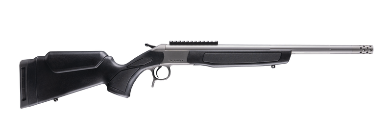 Single-shot rifle chambered in 223 Remington with a 20" stainless steel barrel threaded 5/8x24 for muzzle devices. Features a take-down design, black synthetic stock, 0 MOA Picatinny rail base, reversible hammer spur, and Omni Muzzle Brake. Weighs 6.5 lbs with an overall length of 35" and 1-in-9" rate of twist.