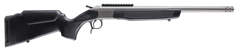 Single-shot break-action rifle chambered in .45-70 Government with a 22" fluted, threaded barrel (11/16x24 muzzle brake). Features a stainless steel receiver with 0 MOA Picatinny rail, adjustable comb and length of pull, black synthetic stock, and weighs 7.8 lbs. Built for hunters seeking a versatile, portable rifle with suppressor-ready design and rugged durability.