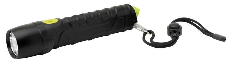 The Cyclops SF-800 is an 800 lumen LED flashlight featuring a CREE XML2 10W LED for bright, reliable illumination. It is IPX7 waterproof rated and includes a glass breaker for emergency use. The flashlight operates on AAA batteries with a push-button switch and measures 10.1" in length.