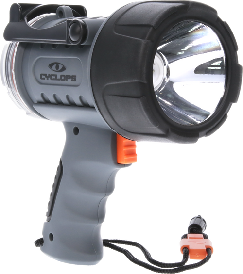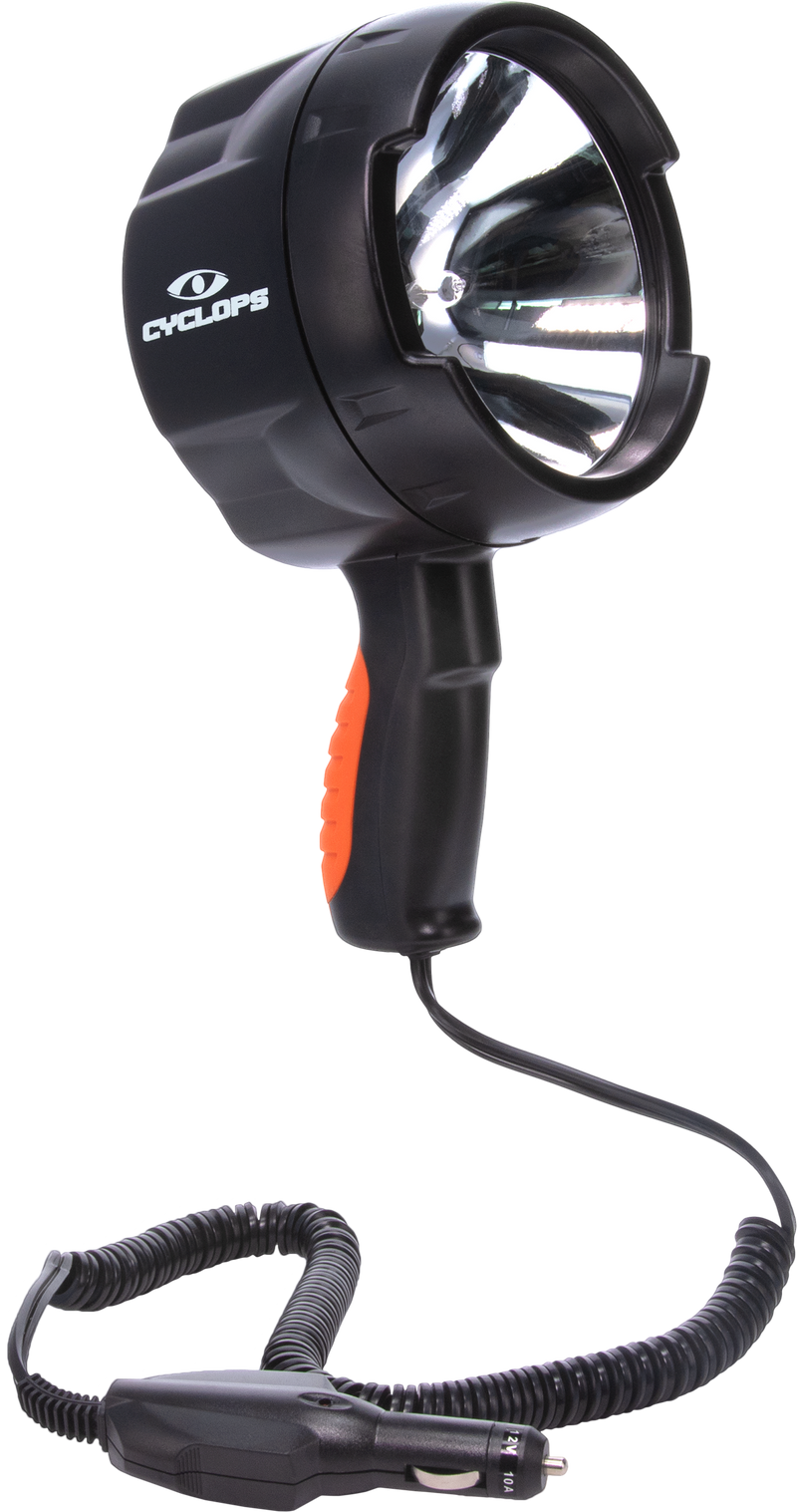 The Cyclops 12V Direct is a handheld spotlight delivering 1400 lumens of white halogen light with a 450-meter beam range. Built with weather-resistant black polymer construction, this 2 lb spotlight is powered by a 12-volt direct connection and features a switch-type activation. Designed for outdoor applications requiring bright, focused illumination.
