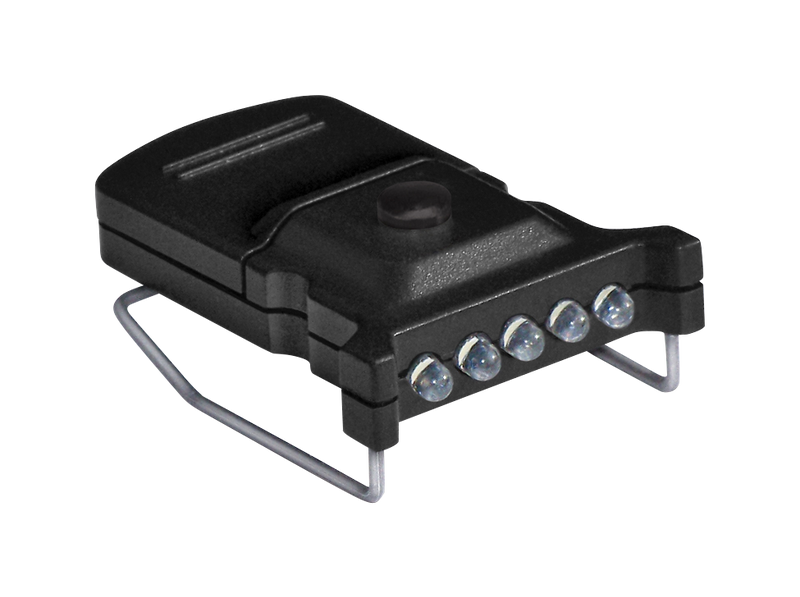 This compact clip-on headlamp delivers 10 lumens from 5 super bright LEDs with a built-in 15-degree tilt adjustment. Weighing less than an ounce with a top-mount design that doesn't obstruct vision, it runs for 118 minutes on two included CR-2016 batteries. The fogproof polymer construction makes it suitable for hunting and outdoor activities.