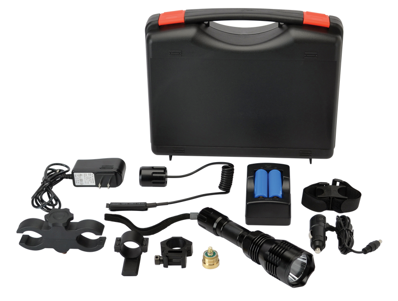The Cyclops Varmint Light Kit is a 250-lumen rechargeable weapon light featuring both red and green LED modules with a range of 200-220 yards depending on color selection. It includes a BRQ scope rail mount adapter with quick-detach 16mm Weaver ring and offers 3-4 hours of burn time on a single charge. The light is constructed from aviation-grade aluminum and is both waterproof and fogproof.