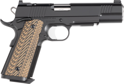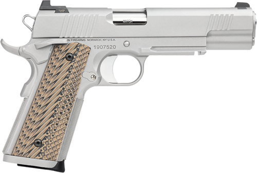 The Dan Wesson Specialist is a full-size 1911-style semi-automatic pistol chambered in 10mm Auto with a 5" barrel and single-action trigger. Built on a forged stainless steel frame with a bead blasted finish, it features fixed tritium night sights, ambidextrous thumb safety, G10 grips, a 1913-style Picatinny rail, and forward cocking serrations. Weighing 42.3 oz with an overall length of 8.75", it ships with two 8-round magazines and is designed for both duty and defensive use.