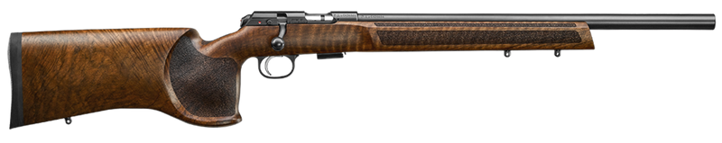 The CZ 457 Varmint MTR is a .22 LR bolt-action rifle with a 20.5" cold hammer-forged match barrel and 5+1 capacity. Features include a Turkish walnut target stock with ergonomic design, adjustable trigger, black nitride finish, and a grooved receiver that is drilled and tapped for optics. This match-chamber rimfire weighs 7.08 lbs and offers 60-degree bolt rotation for smooth cycling.