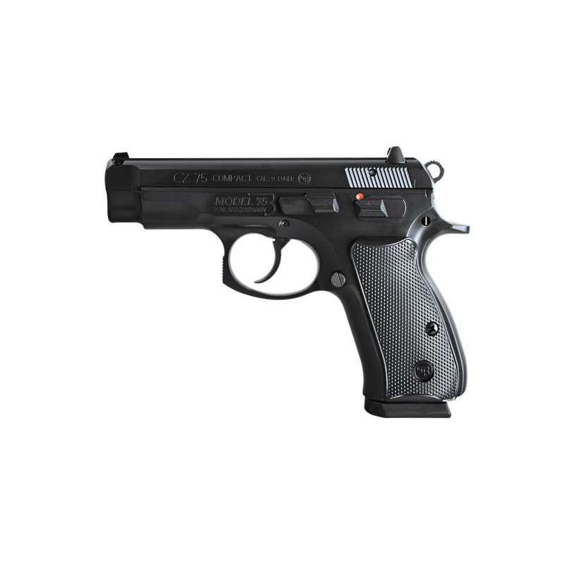 The CZ 75 Compact 50th Anniversary Elite is a double-action/single-action semi-automatic pistol chambered in 9mm Luger with a 3.75" cold hammer-forged barrel and 15+1 round capacity. This compact steel-frame pistol features a manual safety, firing pin block safety, and fixed sights, with black plastic grips and a black polycoat finish. Weighing 32.8 oz and measuring 7.24" overall, it delivers legendary CZ performance in a concealable package, commemorated with 50th Anniversary engraving on the frame.