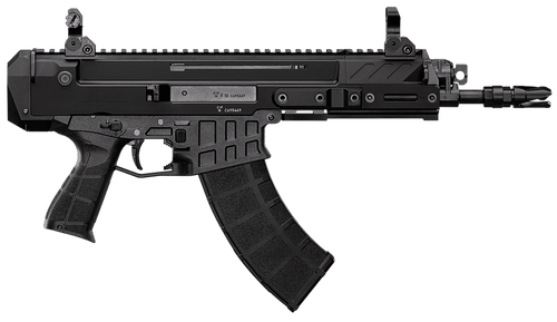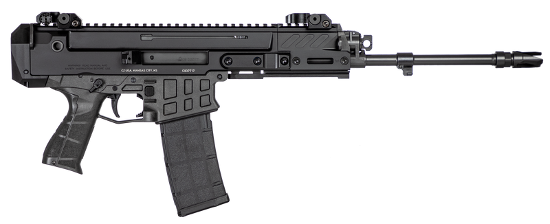 The CZ Bren 2 MS is a 5.56 NATO semi-automatic pistol with a 14" barrel and 30+1 capacity, featuring a lightweight carbon fiber-reinforced polymer frame and aluminum receiver. It includes adjustable folding iron sights, ambidextrous controls, a threaded barrel, and weighs 5.86 lbs with an overall length of 25.8". The pistol is optic-ready with a Picatinny rail and comes with one 30-round magazine.