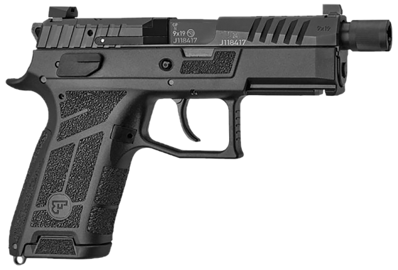 The CZ P-09 C Nocturne SR is a double/single action semi-automatic compact pistol chambered in 9mm Luger with a 4.5" threaded barrel and 17+1 capacity. Features include an optics-ready slide, luminescent fixed sights, manual safety with interchangeable decocker, and a polymer frame with stippled grip. The suppressor-ready threaded barrel (1/2" x 28 UNEF-3A) and Omega SA/DA trigger system make this a versatile duty or carry platform.