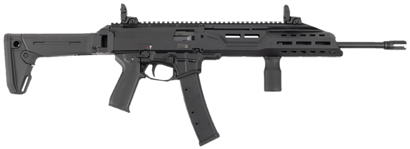 Semi-automatic carbine chambered in 9mm Luger with a 16.3" cold hammer-forged threaded barrel and 35-round magazine capacity. Features a 3-position telescopic folding Magpul stock, M-LOK handguard, ambidextrous controls, and Picatinny rail for optics mounting. Weighs 6.9 lbs unloaded with overall length ranging from 26.4" (folded) to 34" (extended).