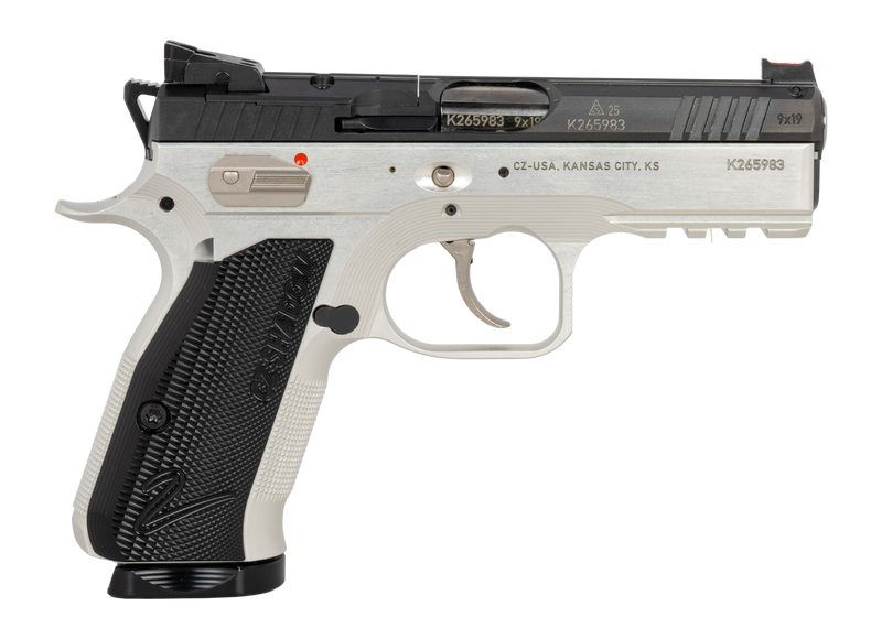 The CZ Shadow 2 Compact is a semi-automatic, double/single action pistol chambered in 9mm with a 4" cold hammer-forged barrel and 15-round capacity. This competition-proven compact features a two-tone finish (clear anodized aluminum frame with black nitride slide), fiber optic front sight with adjustable rear sight, optics-ready cut slide, accessory rail, and aluminum grips, weighing 30 ounces. Includes two 15-round magazines and manual safety.