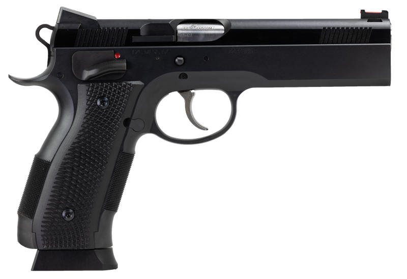The CZ A01-LD is a full-size 9mm Luger semi-auto pistol with a 4.93" match-grade bull barrel and 19+1 capacity. Features a DA/SA action, ambidextrous safety, fiber optic front sight with low-mount rear sight, and a heavily checkered steel frame with beavertail and internal magwell designed to minimize recoil. Includes an integral accessory rail and weighs 51.2 oz.