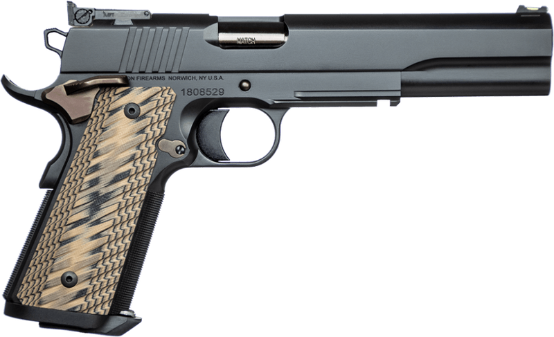 Semi-automatic 1911-style pistol chambered in 10mm Auto with a 6" bull barrel and 8+1 capacity. Features an optics-ready slide with fiber optic front and adjustable rear sights, ambidextrous safety, G10 grips, and tri-tone finish (stainless slide with black/bronze frame). Includes 1913 Picatinny rail, skeletonized hammer, and 25 LPI checkering on the mainspring housing.