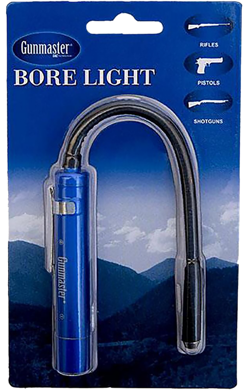 The Gunmaster Flex Bore Light is a LED-illuminated bore inspection tool designed to help shooters examine the interior of gun barrels during cleaning and maintenance. It features a white LED bulb and operates on a single AAA battery (included). The flexible design allows for easy positioning and inspection of bore conditions.