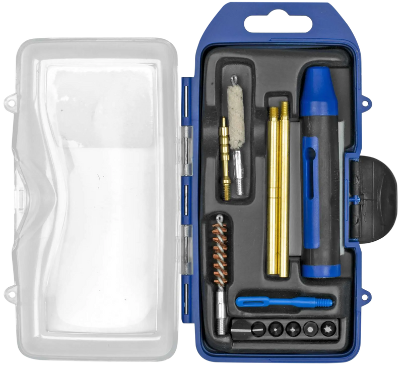 This 14-piece cleaning kit is specifically designed for .22 caliber pistols and includes a two-piece solid brass rod, phosphor bronze brush, mop, brass jag, slotted tip, 25 cleaning patches, and a 6-piece driver bit set. The components are organized in a custom-molded tray housed in a clear-top dual bond molded TPR locking hard case for convenient storage and transport.