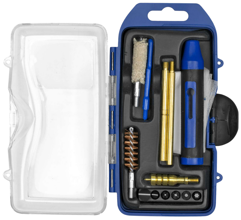 This 14-piece cleaning kit is designed for .40 caliber and 10mm pistols and includes a custom hybrid multi-function case, bronze brushes, brass rods, cleaning patches, and a 6-piece driver bit set. The kit features slotted tips, solid brass jags, and a storage clamshell case for organized portability. Ideal for routine firearm maintenance and field cleaning.